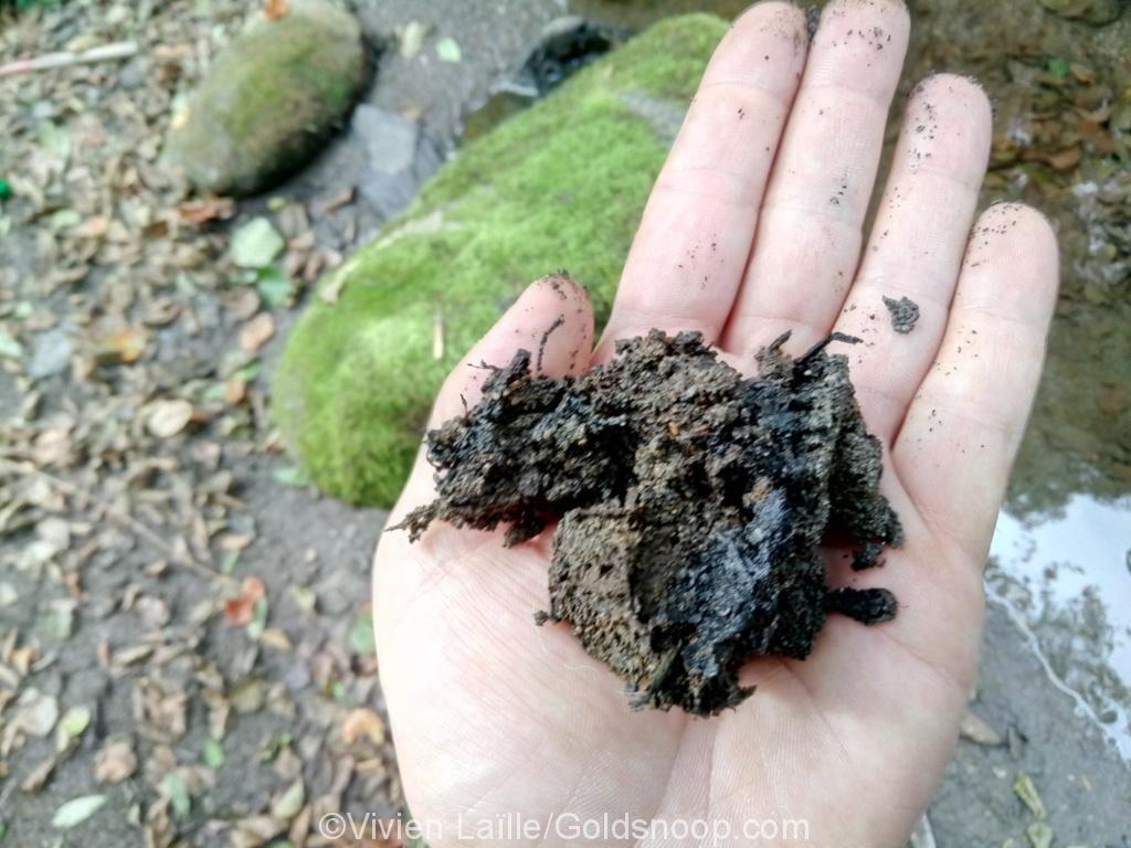 L’or de ces gîtes sulfurés dans lesquels il est invisible et disséminé. C’est dans la rivière, grâce à des conditions chimiques, de pH et d’Ec particuliers, que l’or précipite.