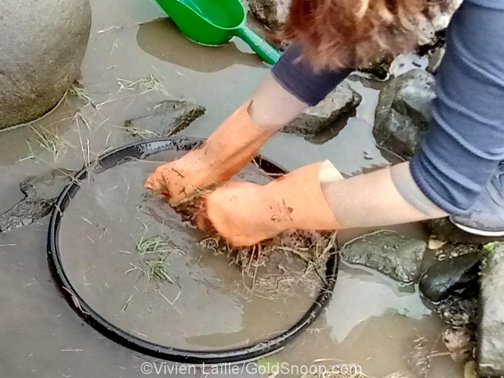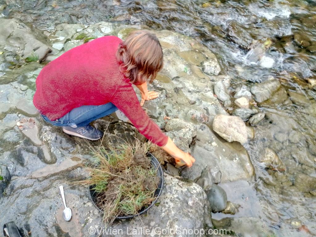 Pour marquer le coup, l’Orpailleuse Mystère a réalisé un test d’échantillon au pan, à partir d’un tapis de touffes de racines d’herbes de 5 à 10 cm d’épaisseur, prélevées directement sur du bedrock.