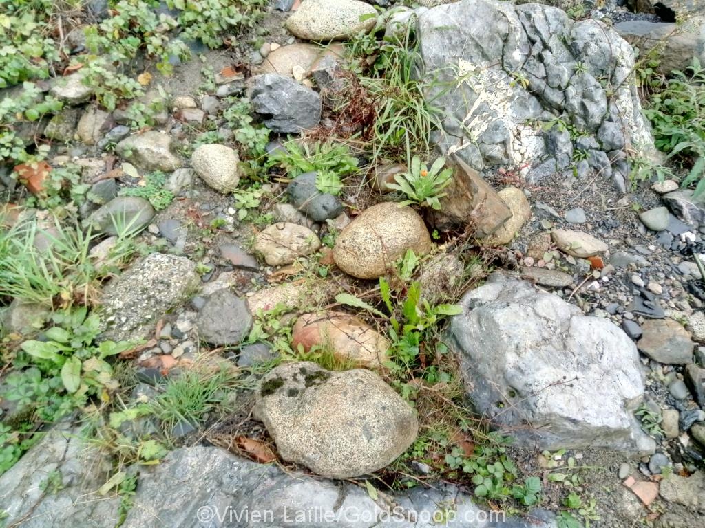 Ce type d’endroit dans une rivière aurifère, gavé d’anfractuosités, de pièges, de rifles, de failles, de touffes végétales, de mousses, peuvent être des lieux de grandes concentrations aurifères.