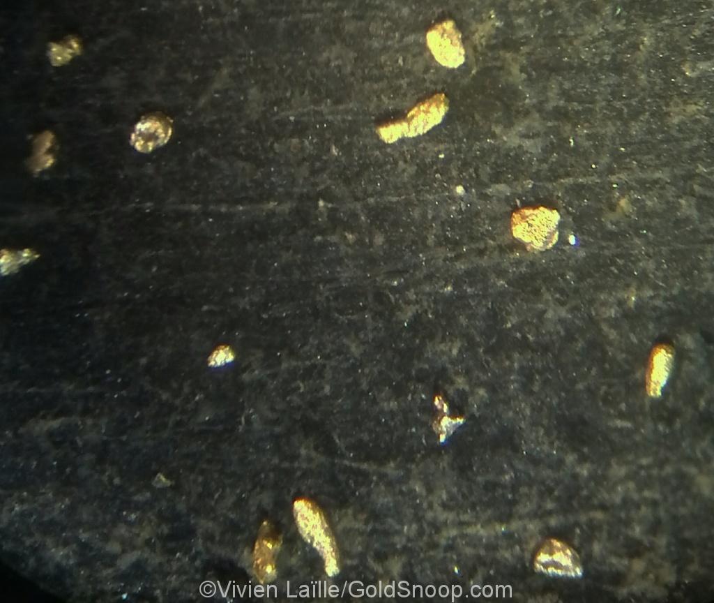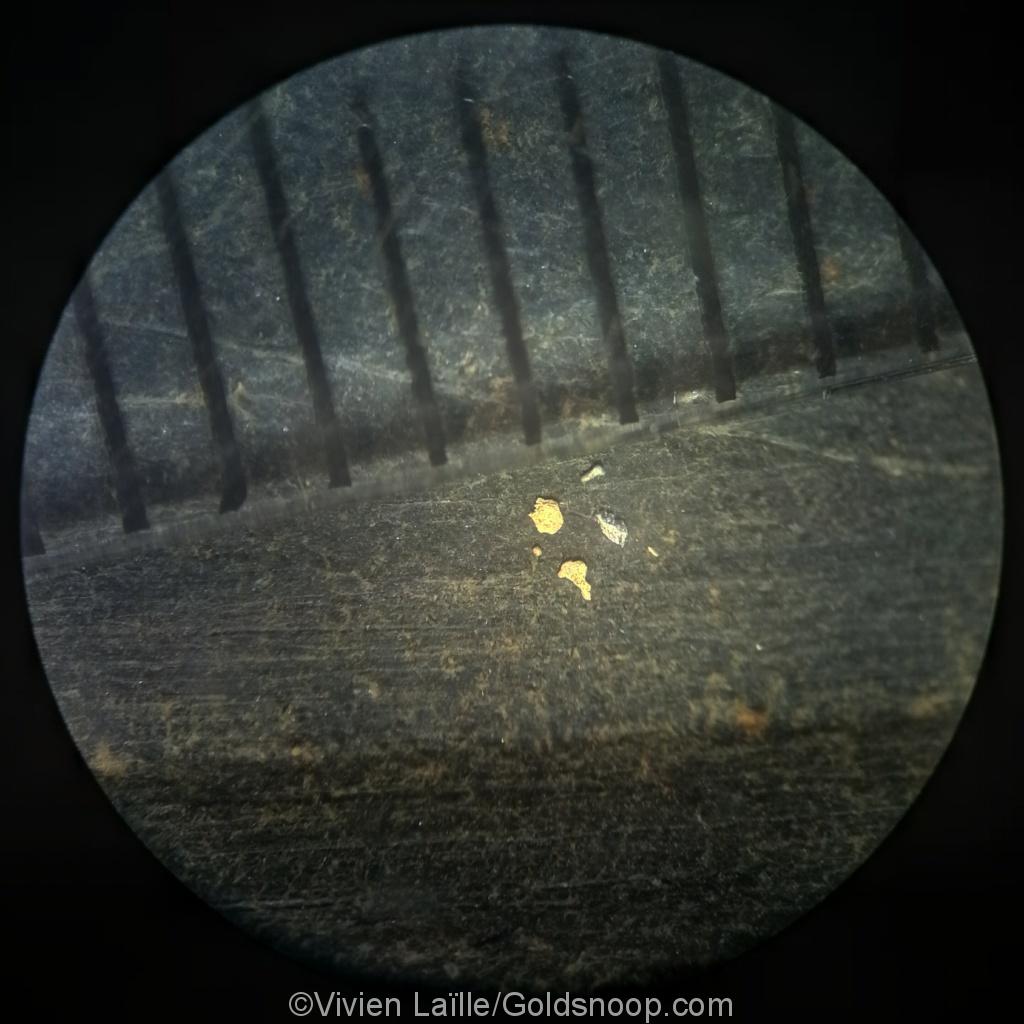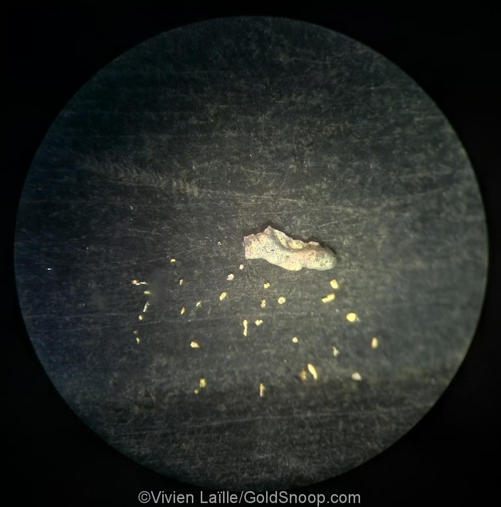Un test d’échantillonnage très prometteur, car très positif ; en tout la présence d’une quarantaine de paillettes fines qui ont été découvertes dans un seul et unique pan, composé d’un sable très fin et riche en sables noirs, très métallique.