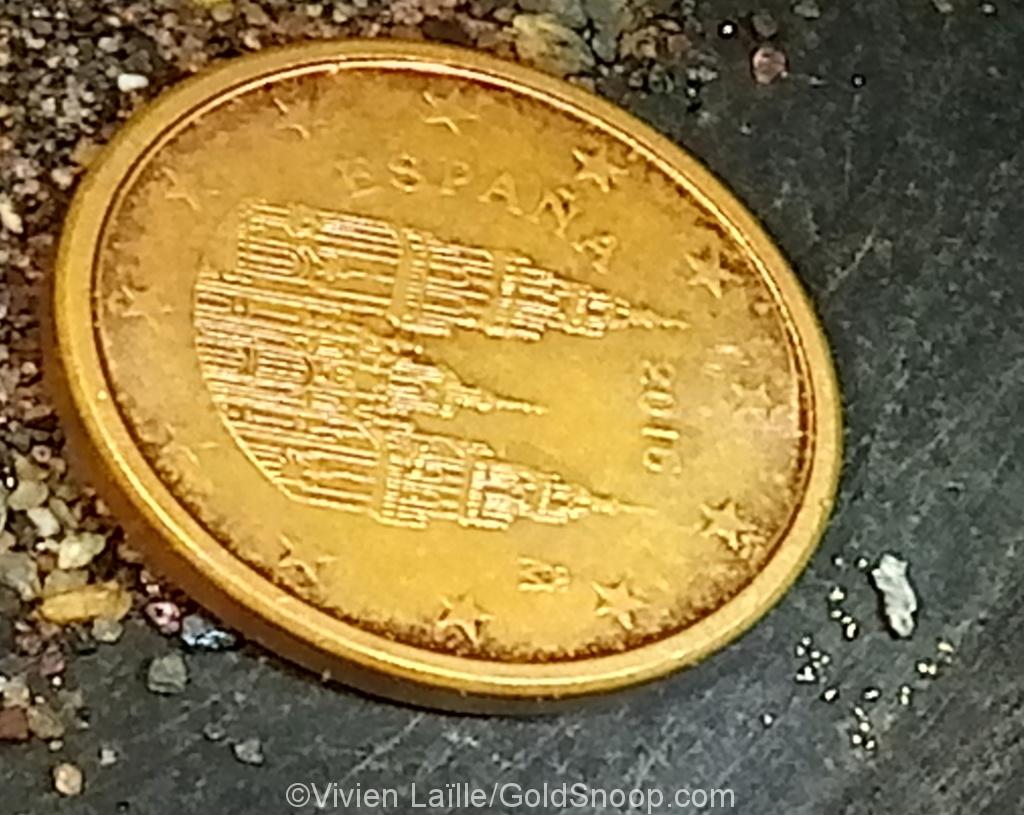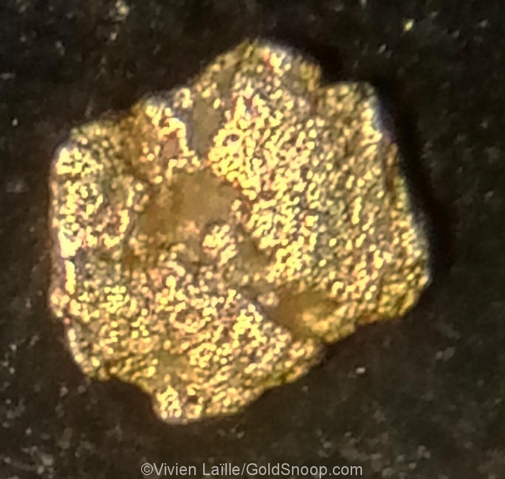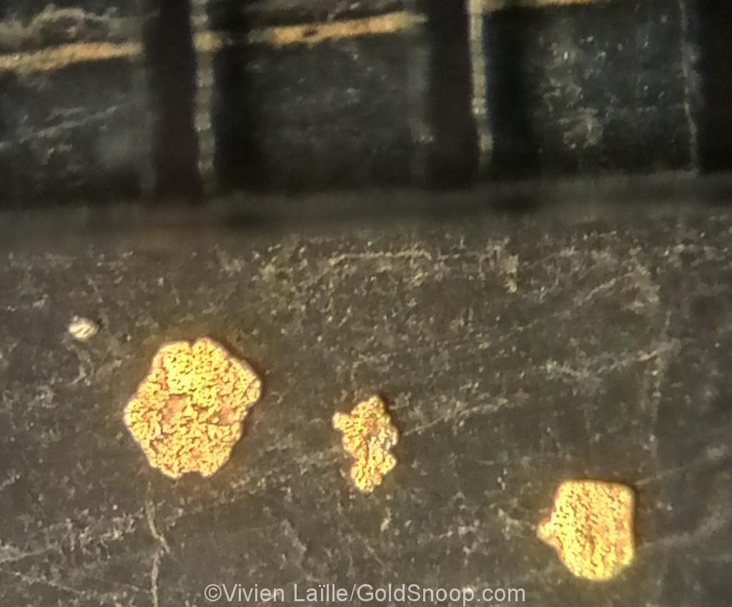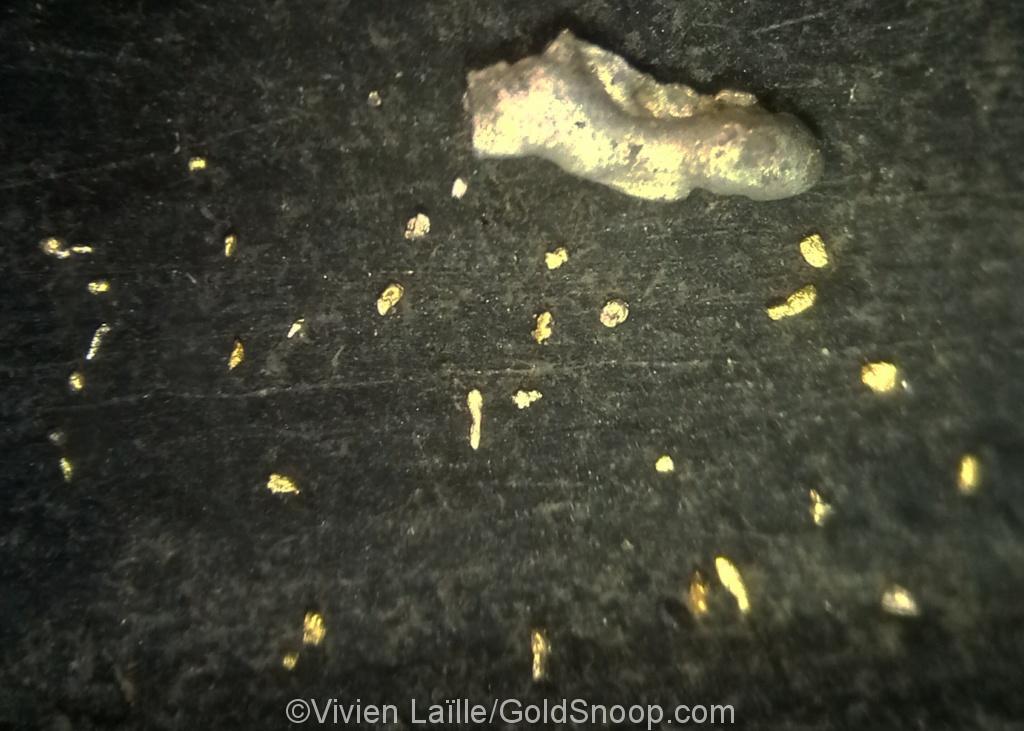 Un test d’échantillonnage très prometteur, car très positif ; en tout la présence d’une quarantaine de paillettes fines qui ont été découvertes dans un seul et unique pan, composé d’un sable très fin et riche en sables noirs, très métallique.