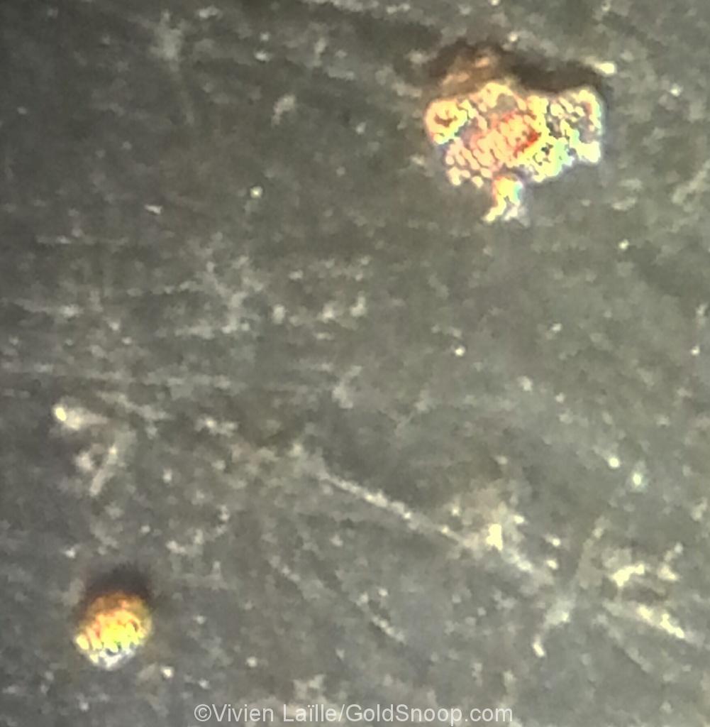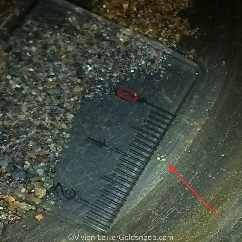 L’Orpailleuse Mystère a découvert un joli lot de petites paillettes d’or fines dans son pan, en tout une quarantaine de spécimens dont 4 plus imposantes.