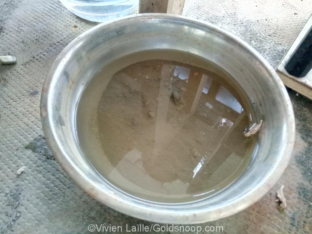 Si on travaille avec du vrai concentré de sable noir, et parole de prospecteur, il faut trouver un moyen pour que le sable noir puisse partir sans perdre de paillettes ou de grains, par brassage, via le courant de l’eau.