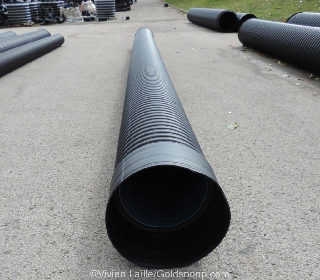 Ci-dessous: les gros tuyaux annelés sont réputés être d’excellents pièges à or, à cause de l’alternance des anneaux successifs. Cette information est confirmée par des prospecteurs québécois. Les anneaux de différentes hauteurs et régulièrement espacés, jouent le rôle de rifles. Ces types d’endroits sont intéressants pour y entreprendre quelques recherches parce qu’ils agissent comme des véritables sluices. Certains prospecteur en utilisent même des tuyaux plus petits, pour concentrer des sables noirs en tant que sluice économiques qu’ils fabriquent eux même.