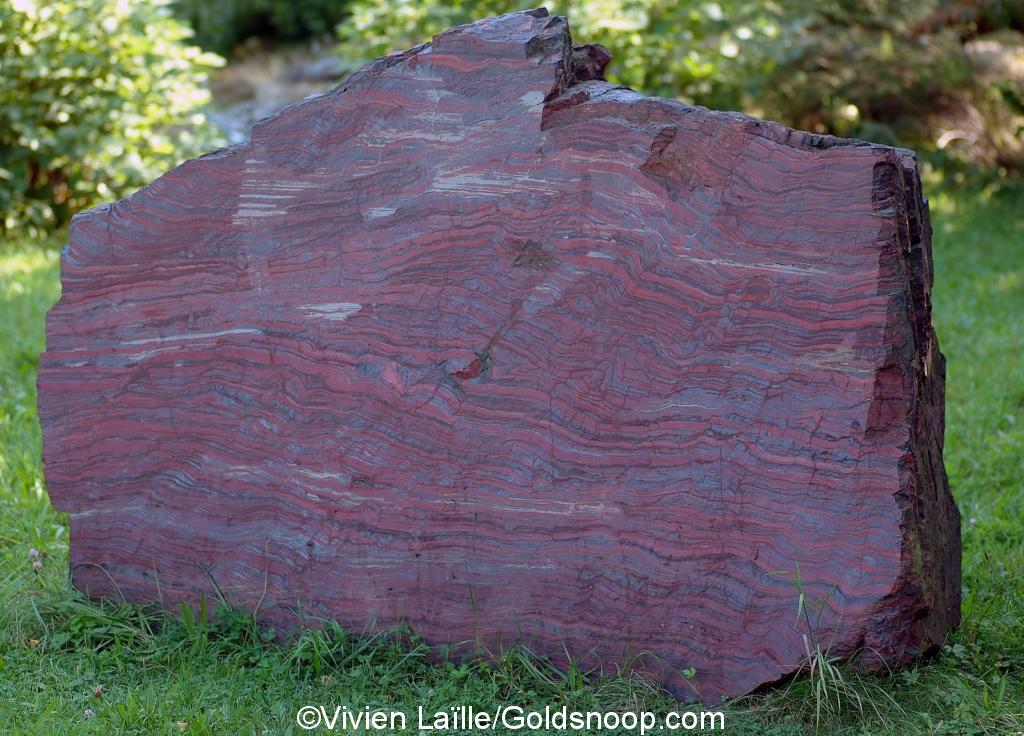 Ci-dessous: des exemples de dépôts de BIF tel que nous pourrions les découvrir dans la nature. Comme pour les couches successives visibles dans un tronc d’arbre coupé, les différentes couches successives visibles des BIF marquent les saisons successives au fil du temps. Ce sont des témoignages géologiques de temps très anciens.