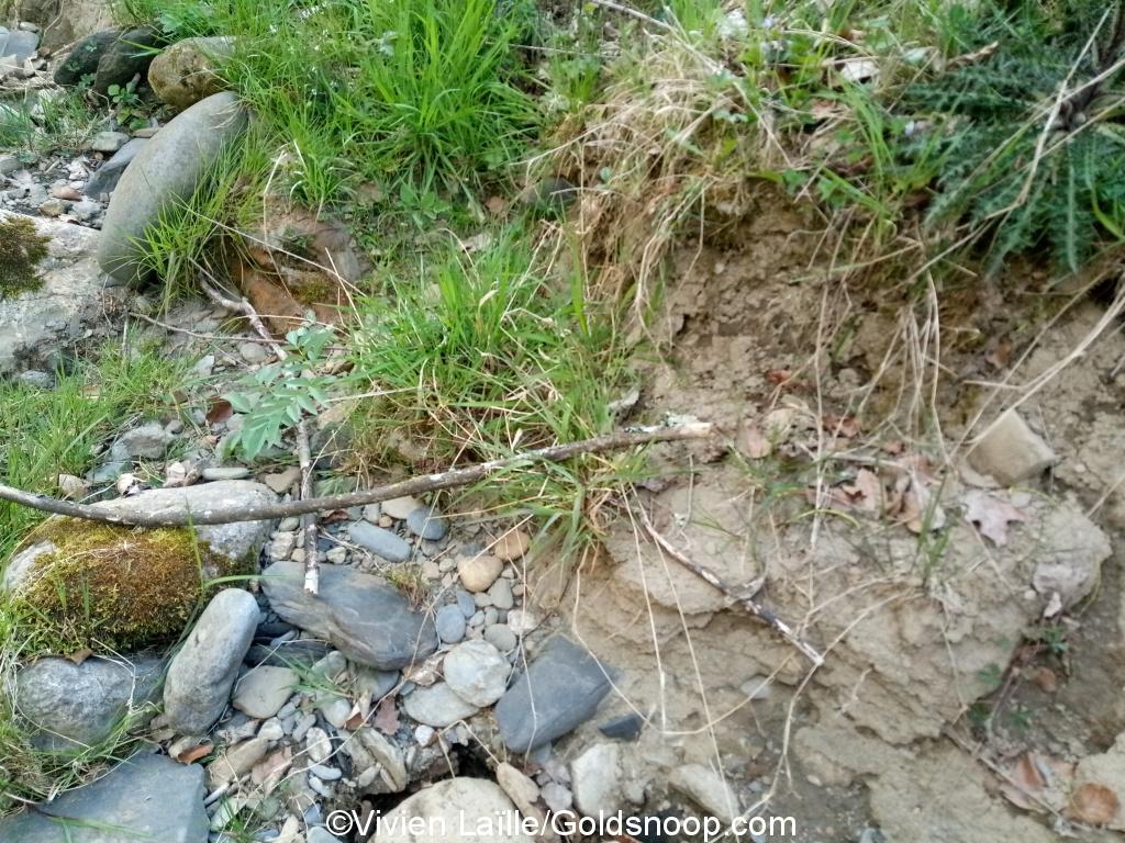 Je vous présente ci-après une vidéo de ma sortie de prospection et de mes recherches ; comme vous pourrez le constater, j’ai réussi à découvrir quelques paillettes et grains d’or dans cet affleurement terreux.