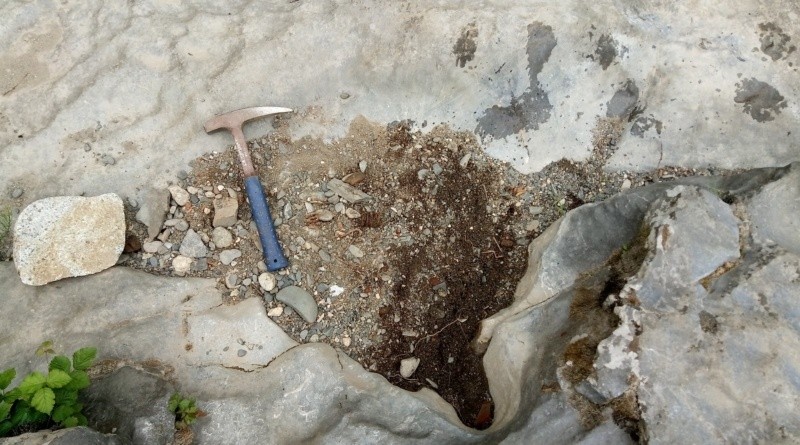Une marmite à graviers et glaises aurifères dans du bedrock rocheux